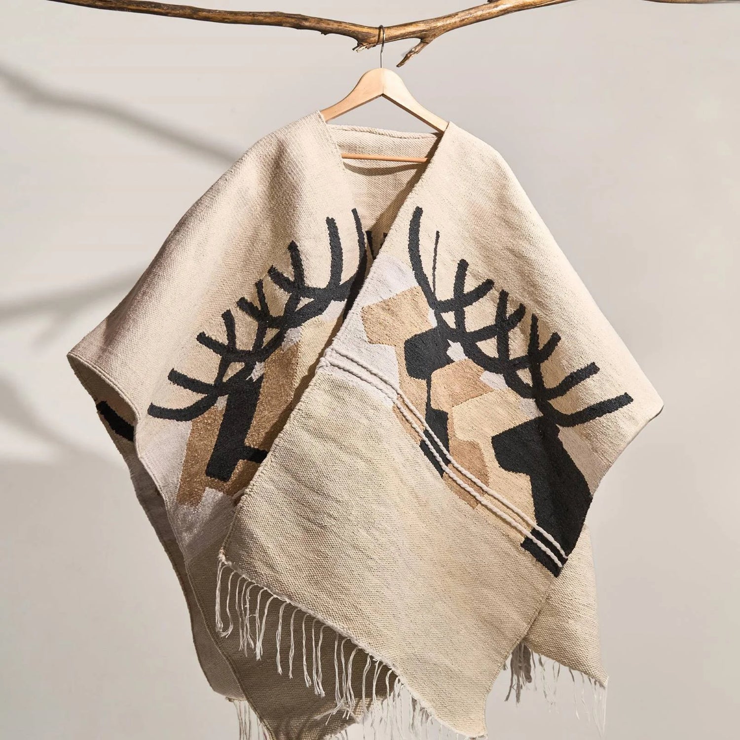 The qurban poncho is a bold statement piece, designed with repeated buffalo motifs on anearthy backdrop. More than just a garment, it serves as a unique decoration for your home orpersonal style.