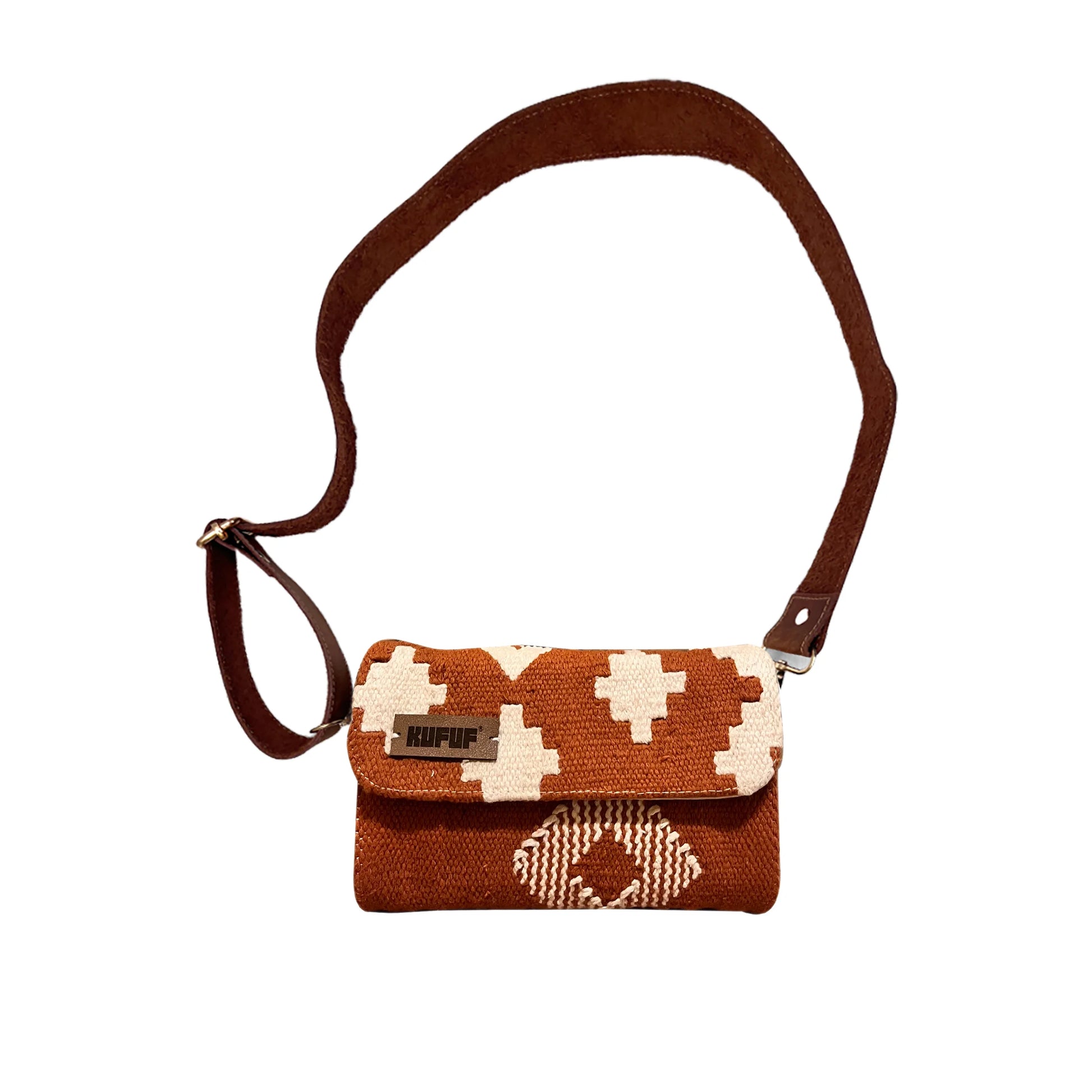 A Small Handbag with a handcrafted cotton kilim exterior opens to a fabric-lined interior with an easy-to-access zipped pocket, with leather sides and adjustable strap.