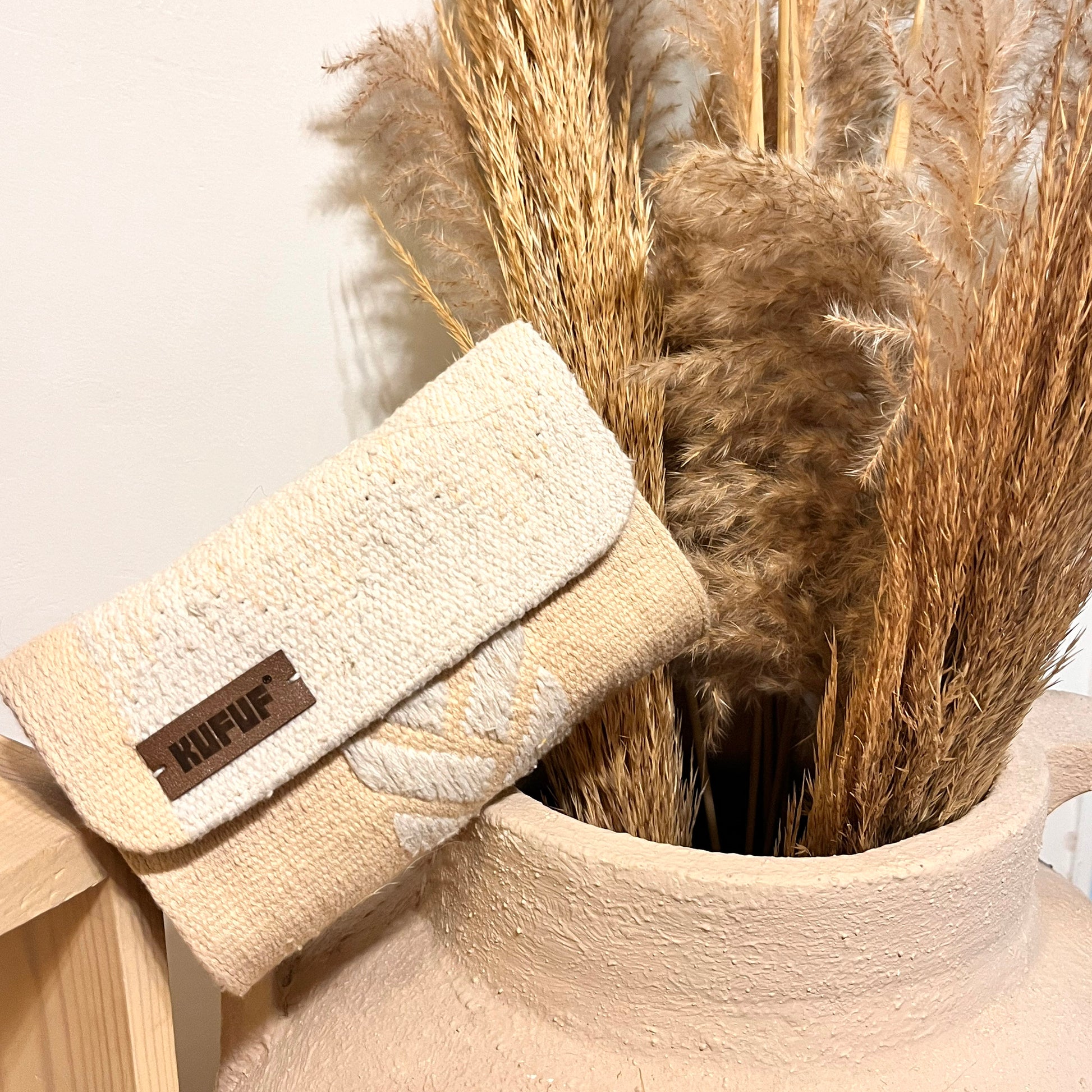 Natural cotton, flat-woven on cotton base. Other materials such as natural leather and wool may be integrated.